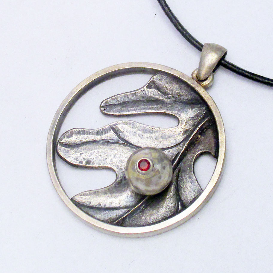 Ezúttal az ezüst tölgylevélen képződött nagy gömb gubacs anyaga aranyból, palládiumból, és ezüstből készült mokume gane.