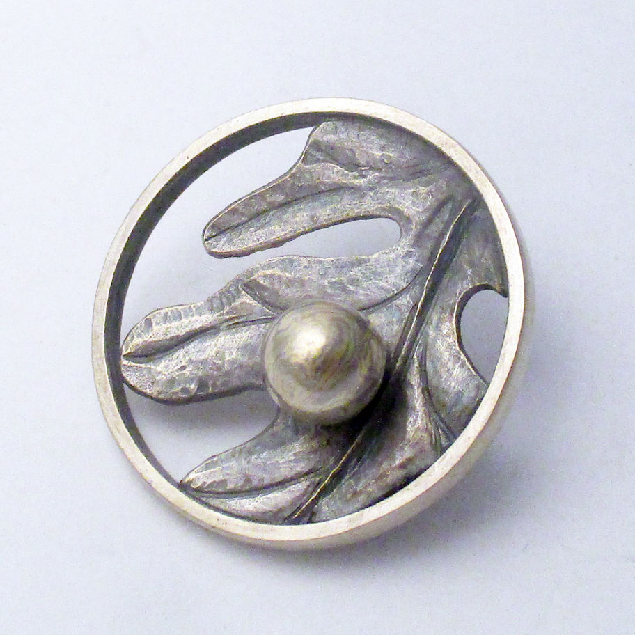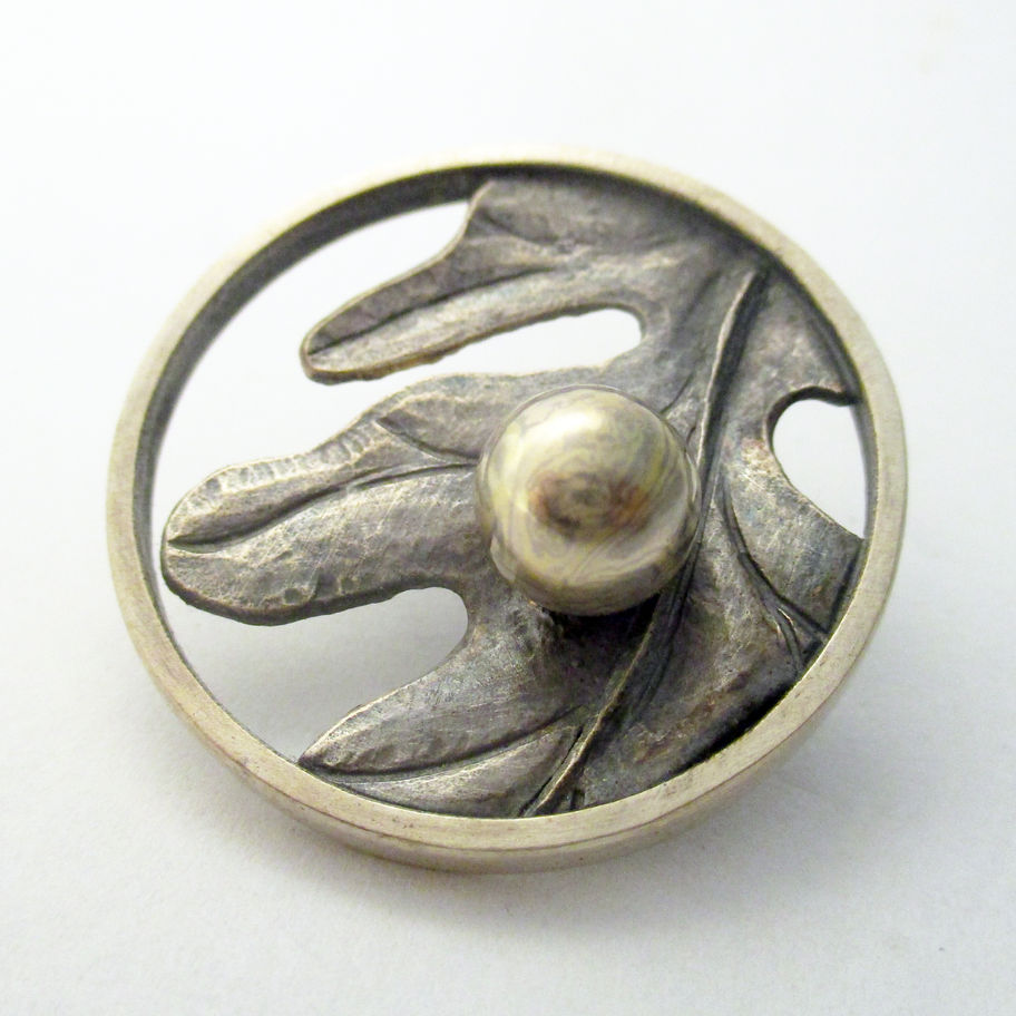 Ezúttal az ezüst tölgylevélen képződött nagy gömb gubacs anyaga aranyból, palládiumból és ezüstből készült mokume gane.